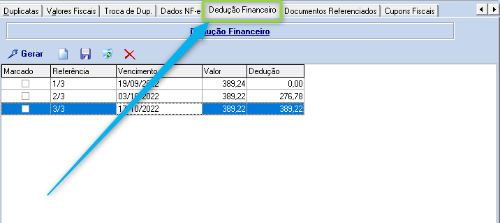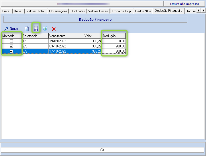 Ação: Após preencher a fatura normalmente, será exibida a aba “Dedução Financeira”.