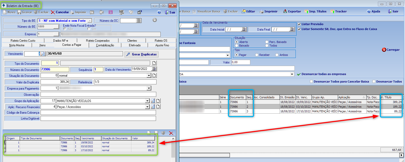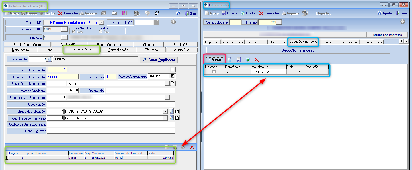 Atenção: Para que seja feito a dedução financeira, o contas a pagar do BE tem que estar aberto. (Caso esteja fechado é só gerar o financeiro da fatura normalmente).