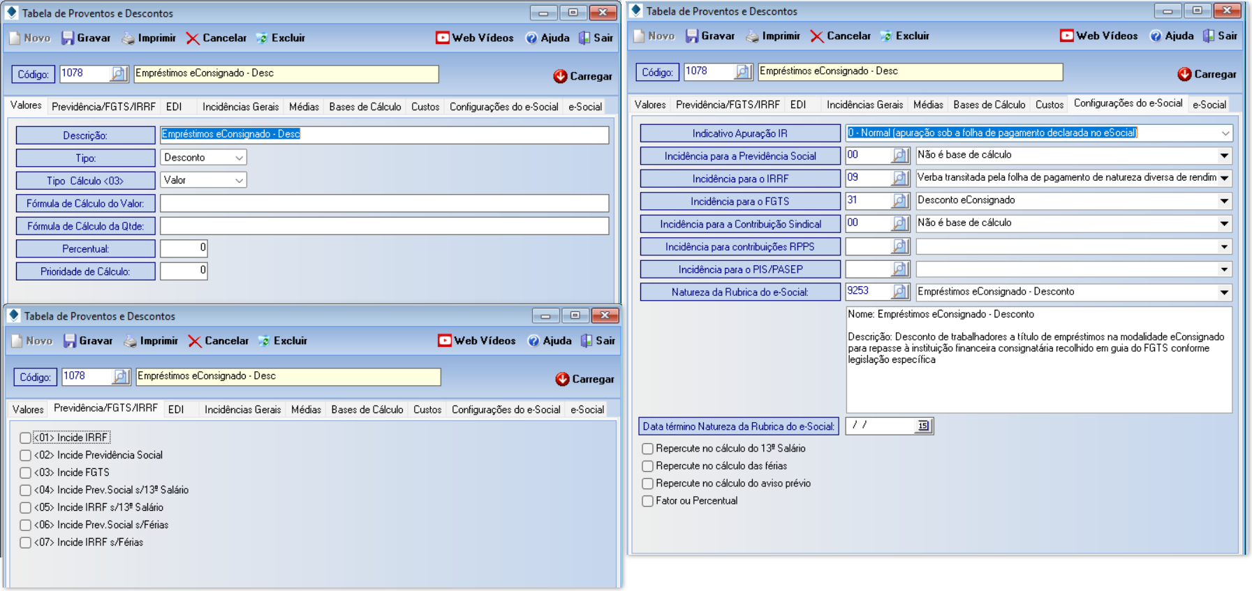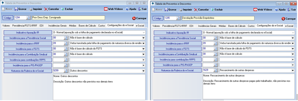 Abaixo as configurações dos PDs para o esocial, deverá ser na rubrica 9299 o desconto da provisão do empréstimo e 1629 a devolução do valor na folha: