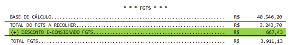 • No menu Relatórios > Folha Mensal > Resumo da Previdência Social e FGTS, na parte do FGTS, será demonstrado separadamente o valor do desconto do e-consignado FGTS que será somado na guia do FGTS digital para que a empresa repasse o valor descontado do funcionário ao governo:
