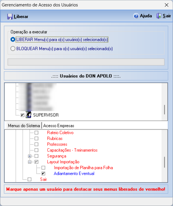 • Entre no menu Ferramentas > Gerenciamento de Acesso dos Usuários e libere para seu usuário o menu Arquivo > Cadastros > Layout Importação > Adiantamento Eventual: