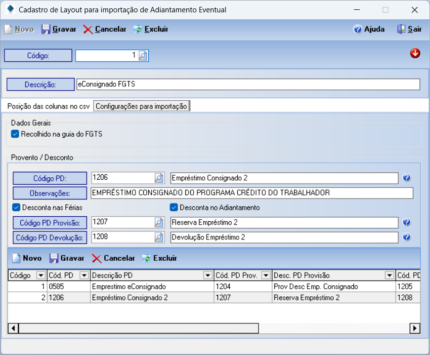 • Entre no menu Arquivo > Cadastros > Layout Importação > Adiantamento Eventual, selecione o código 1, carregue , informe o novo PD de empréstimo consignado no campo abaixo em destaque e grave.