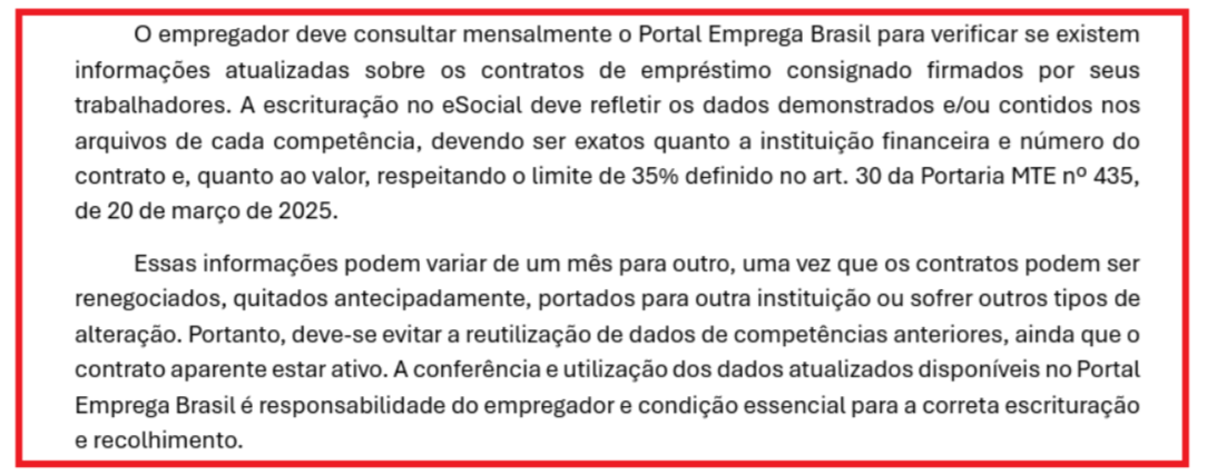 Observação importante: Segundo o manual do Empréstimo do eConsignado, o empregador deverá baixar o arquivo contendo os empréstimos dos funcionários da empresa MENSALMENTE e realizar a importação no sistema também mensalmente, devido a variação que poderá acontecer, como por exemplo, contratos renegociados, quitados, portados para outra instituição, etc.