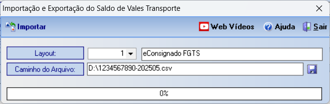 • Selecione o layout 1 do empréstimo consignado, o caminho do arquivo exportado do esocial e “Importar”: