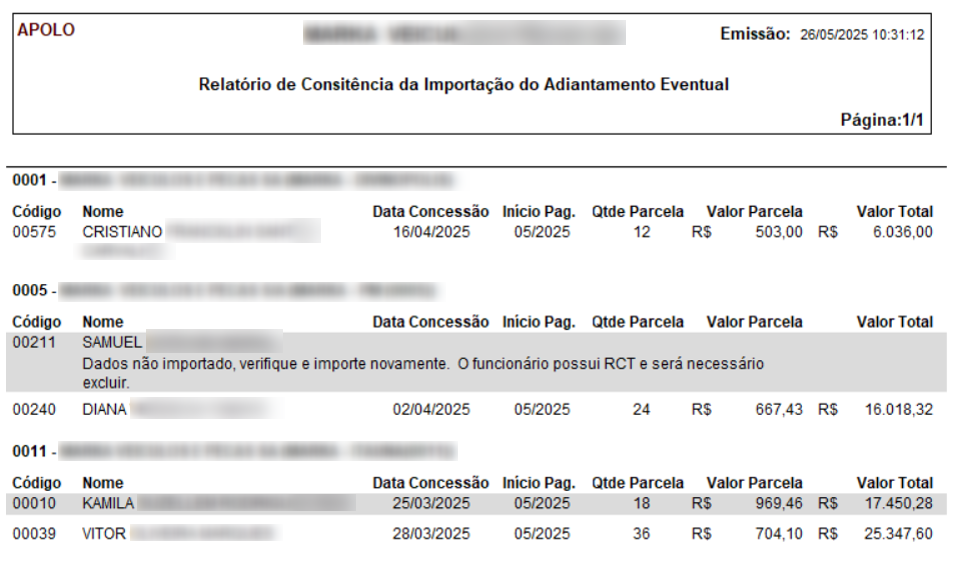 • Após importação será gerado um relatório de log de todos os empréstimos importados por empresa, demonstrando se existe algum funcionário com RCT gerada no sistema, que neste caso não será importado pois a RCT já está gerada.