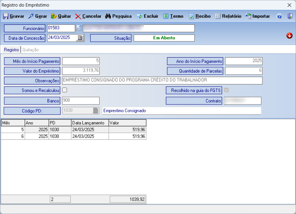 Se o funcionário tiver um segundo contrato de empréstimo e não existir no Layout Importação o PD cadastrado, o sistema apresentará uma mensagem na importação solicitando o cadastro, antes de importar o arquivo.