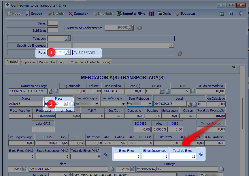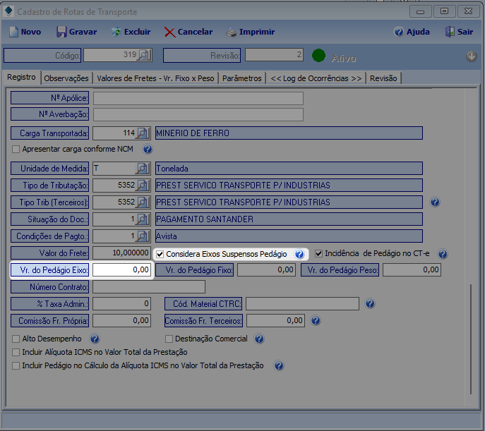 OBS.: O valor do Pedágio Eixo informado na Rota não será considerado para emitir o Vale Pedágio. Esse valor será fornecido pelo Fornecedor de VPO (Vale – Pedágio Obrigatório) habilitado na ANTT.