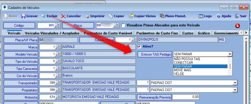 No cadastro de Veículos, Arquivo / Tabelas / TMS – Transportes/ Veículo, temos o campo Emissor TAG pedágio. Informe a opção conforme o contrato da sua empresa.