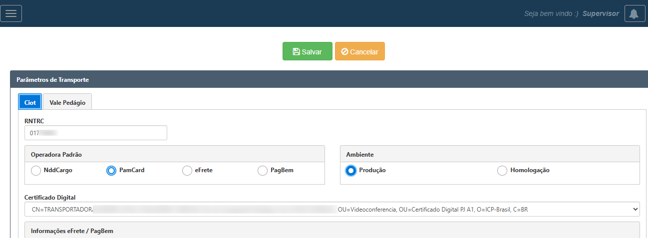 No Widjet, acesse o menu: Cadastros / Parâmetros / Transporte, na aba Ciot, verifique se as informações estão corretas e o Ambiente está selecionado a opção Produção.