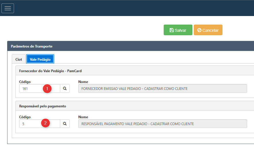 Em seguida na aba Vale Pedágio, vamos informar o (1) Fornecedor do vale Pedágio e o (2) Responsável pelo Pagamento do Vale Pedágio. Ambos os cadastros deverão ser previamente realizados como Cliente no sistema Corporate ERP.
