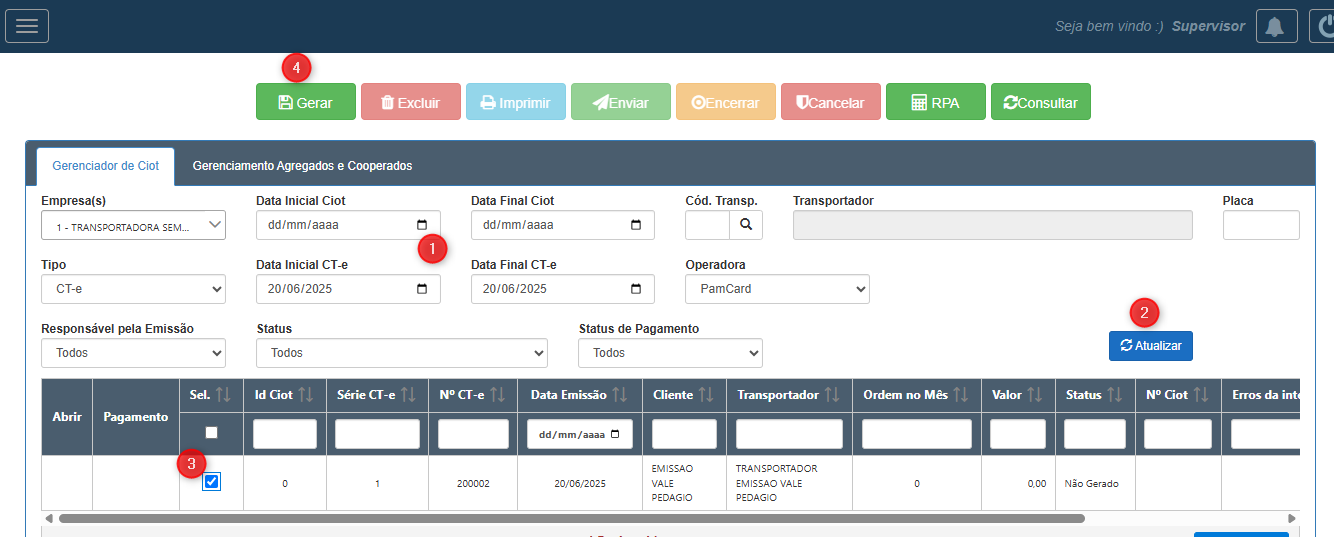 No gerenciador de Ciot, informe os dados para filtrar o CT-e gerado anteriormente. Nesse exemplo, utilizamos o filtro por (1) Data, em seguida selecione a opção (2) Atualizar para exibir os CT-es disponiveis. (3) Selecione o CT-e e a opção (4) Gerar.