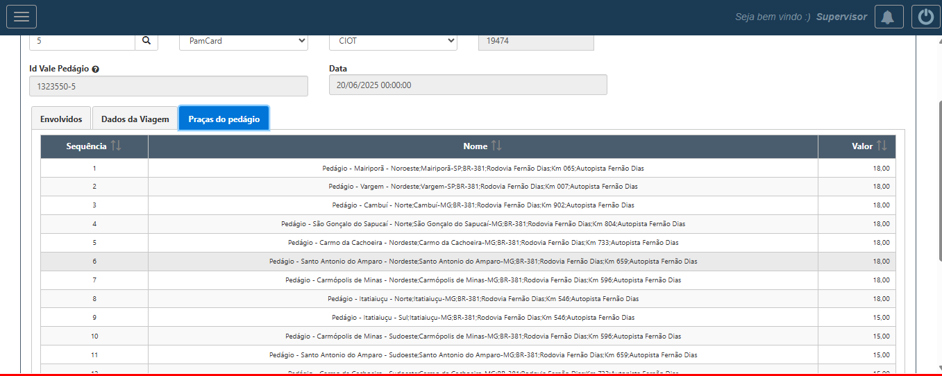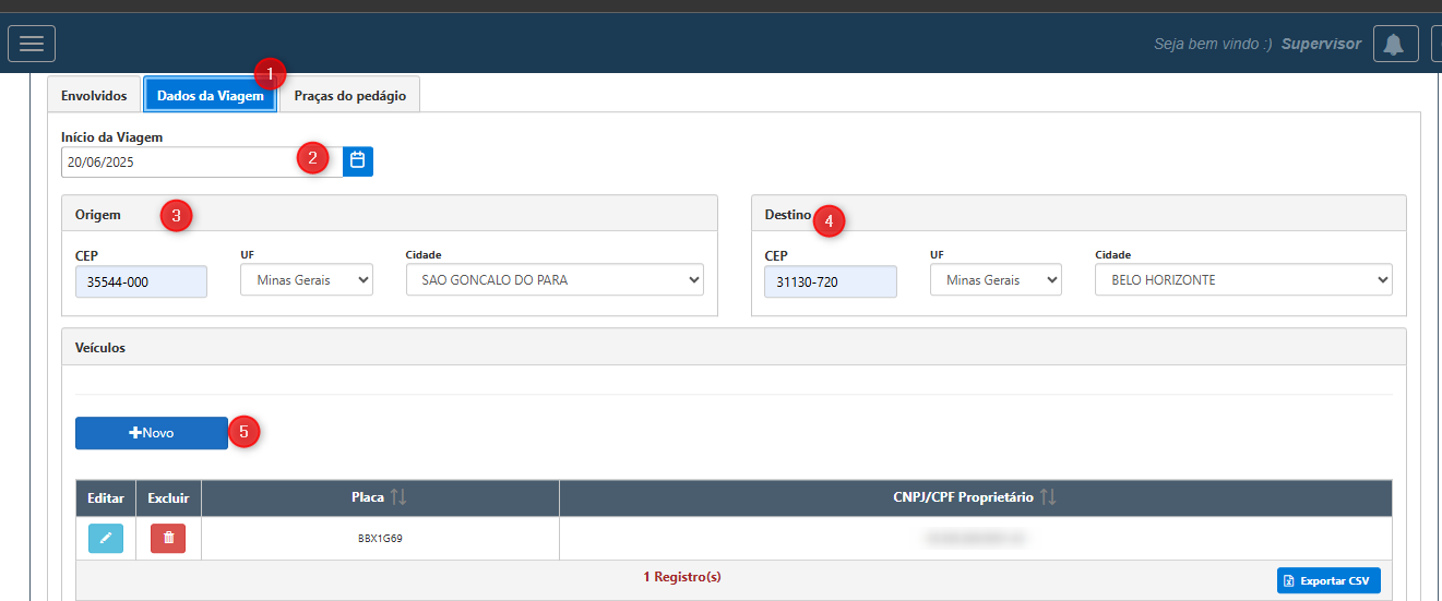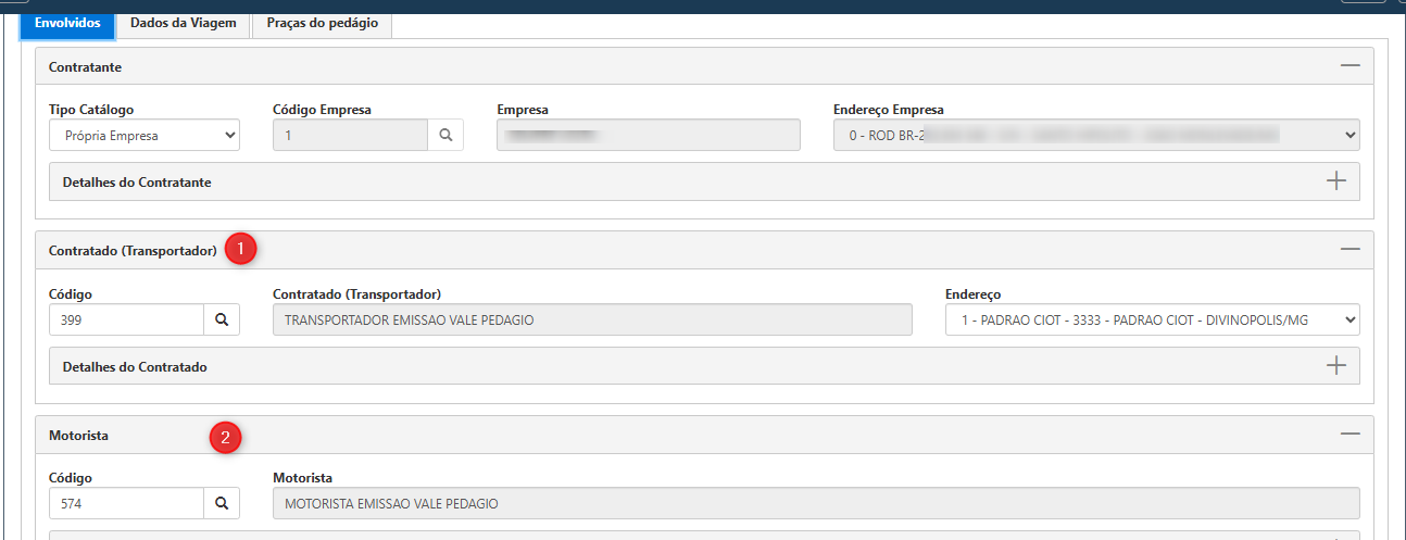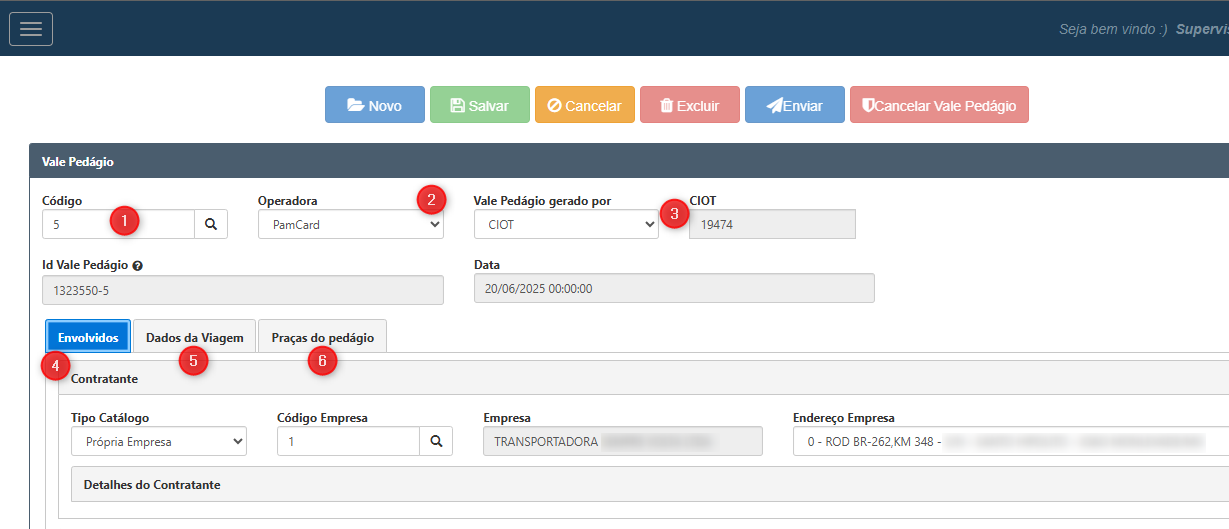 Ainda na tela inicial, temos 3 abas com as informações dos (4) Envolvidos na operação, (5) Dados da Viagem e (6) Praças do Pedágio.