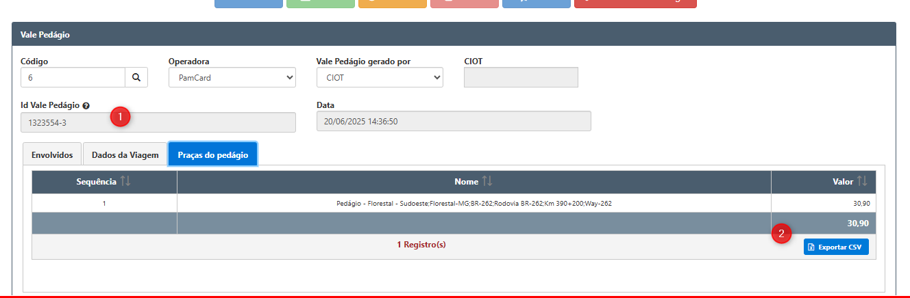 Será gerado o (1) Id Vale Pedágio e a aba (2) Praças do Pedágio será preenchida.