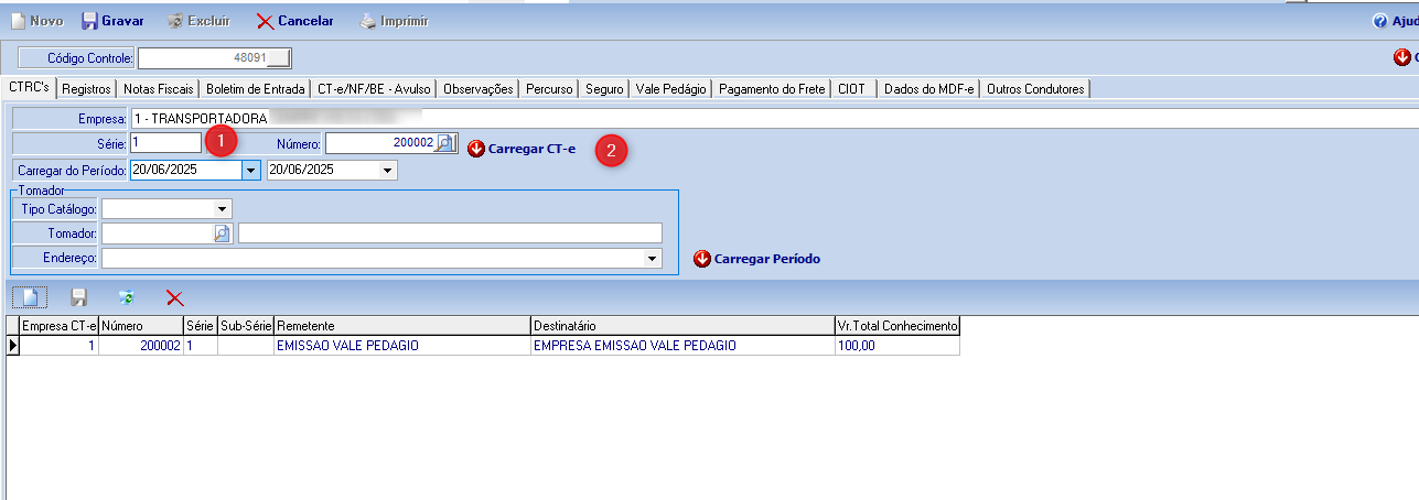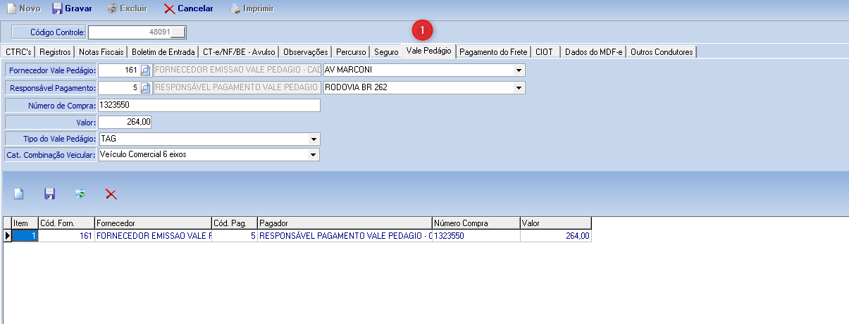 Na aba (1) Vale Pedágio, os dados são preenchidos de forma automática de acordo com o Vale Pedágio emitido.