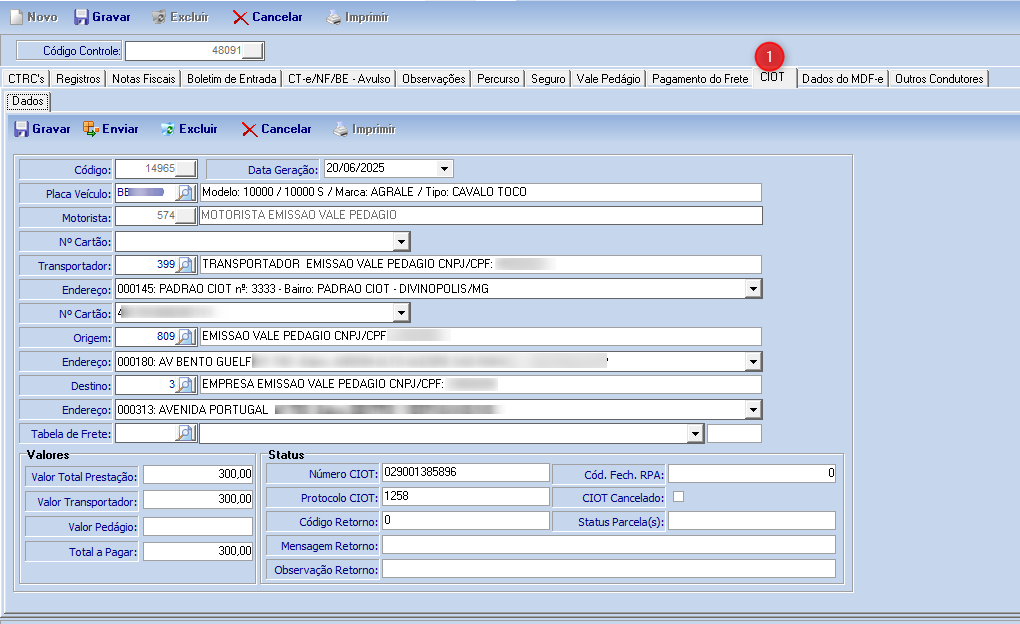 A aba (CIOT) também será preenchida de forma automática de acordo com o CIOT gerado.